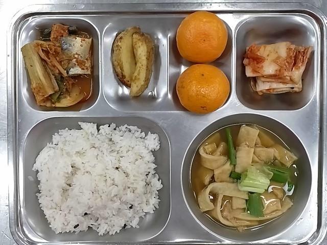 중식: 혼합잡곡밥, 어묵미소국, 고등어김치조림, 갈릭웨지감자, 배추김치, 귤