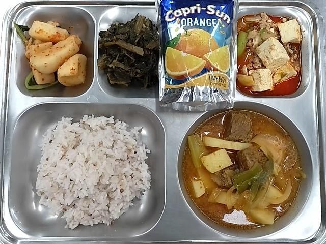 석식: 수수밥, 쇠고기감자국, 시래기된장볶음, 마파두부, 총각김치, 카프리썬