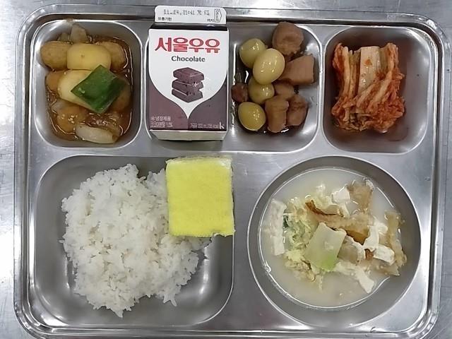 조식: 흰밥, 황태채달걀국, 메추리알돈육장조림, 감자어묵조림, 배추김치, 고구마케익, 가나초코우유