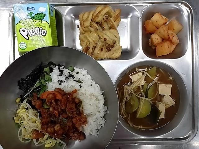 석식: 낙지야채비빔밥, 팽이된장국, 깍두기, 미니메이플피칸, 피크닉복숭아