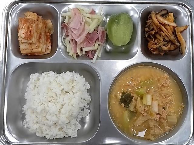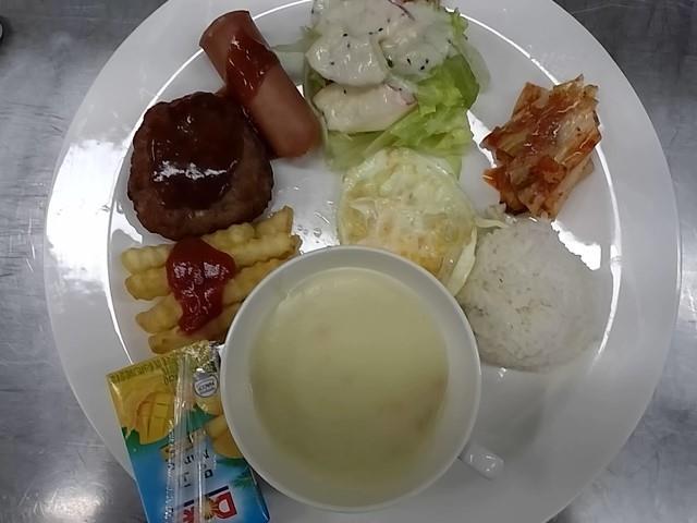 중식: 흰밥, 옥수수스프, 고매합박, 양상추사과샐러드+키위소스, 감자튀김, 오이피클, 배추김치, 돌망고쥬스