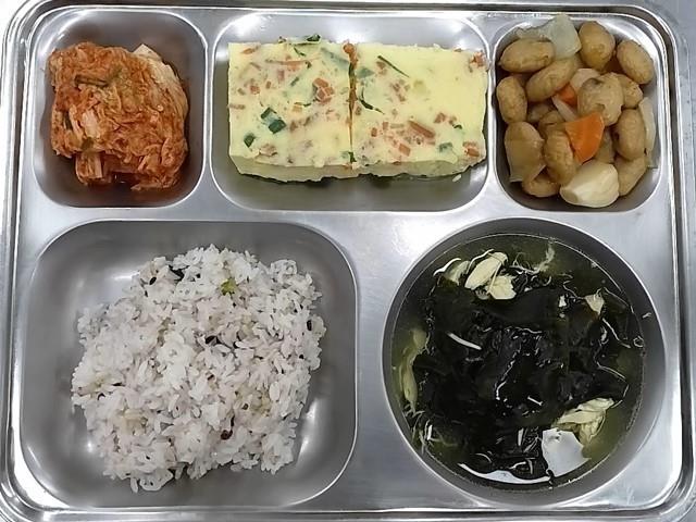 조식: 혼합잡곡밥, 닭고기미역국, 흑임자계란찜, 우엉어묵볶음, 배추김치