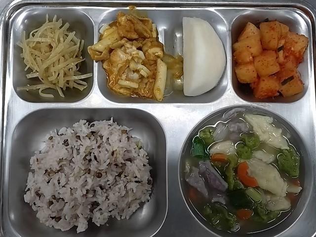 중식: 혼합잡곡밥, 삼색수제수제비국, 쥐어채볶음, 치즈불닭, 깍두기, 배