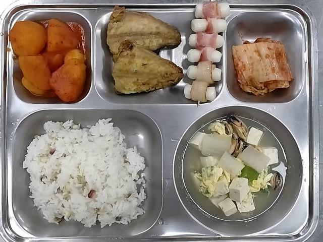 석식: 옥수수밥, 홍합두부탕, 매알감자매운조림, 베이컨떡말이꼬지, 간고등어구이, 배추김치