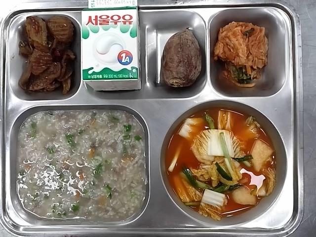 조식: 쇠고기야채죽, 나박김치, 오복채무침, 꿀고구마, 배추김치, 우유