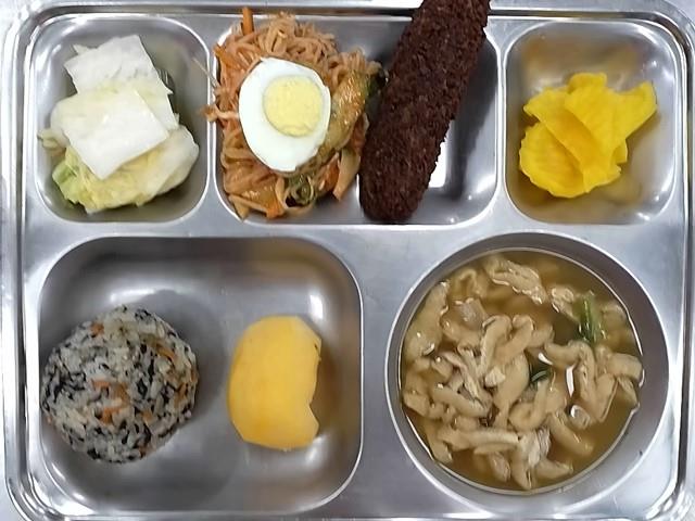 중식: 김가루주먹밥, 유부미소국, 쫄면, 돼지바핫도그, 꼬들또들단무지, 백김치, 단감