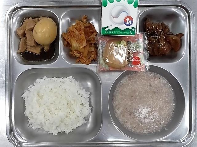 조식: 흰밥, 숭늉, 계란돈장조림, 모듬장아찌고추장무침, 김치볶음, 꽃사과파이, 우유