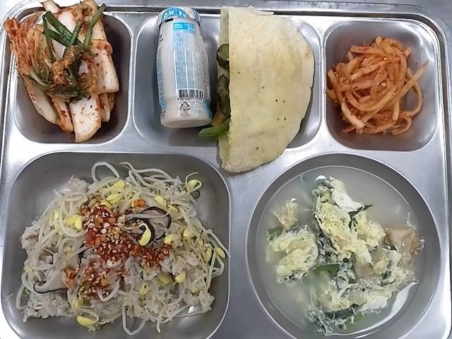 중식: 쇠고기콩나물밥, 북어부추달걀국, 치킨피타브레드, 통배추겉절이, 무생채, 이오