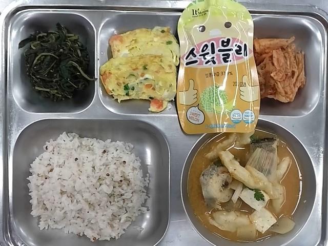 석식: 혼합잡곡밥, 동태국+수제비사리, 개살계란말이, 깻순나물, 배추김치, 멜론쥬스