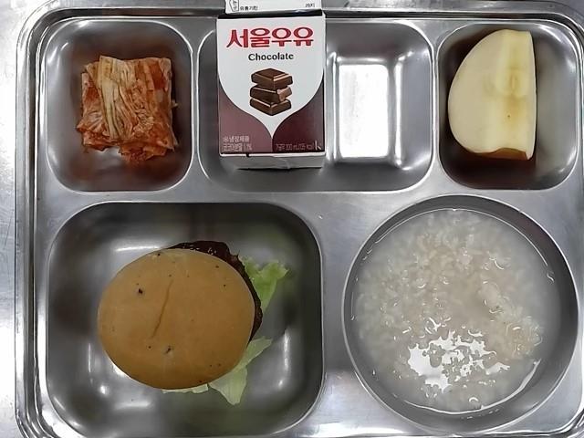 조식: 불고기버거, 초코우유, 사과, 숭늉+배추김치