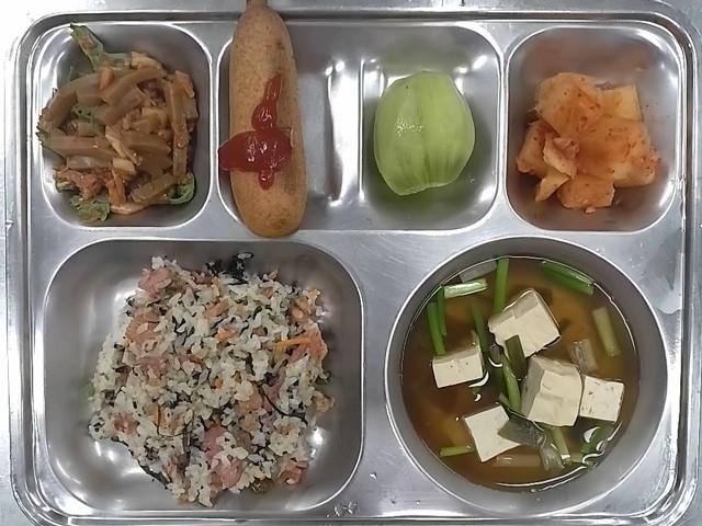 석식: 오리훈제볶음밥, 미소된장국, 도토리묵김치무침, 깍두기, 감자핫도그, 키위