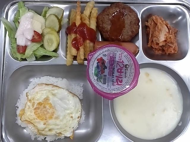 중식: 흰밥, 옥수수크림스프, 고메함박, 양상추사과샐러드, 감자튀김, 오이피클, 배추김치, 베리쥬스