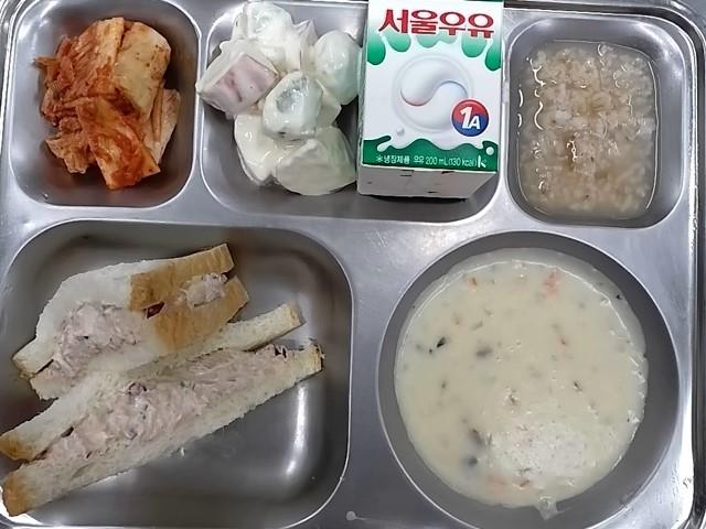 조식: 셀프참치샌드위치, 콘차우더스프, 단감과일샐럿, 우유, 숭늉/배추김치