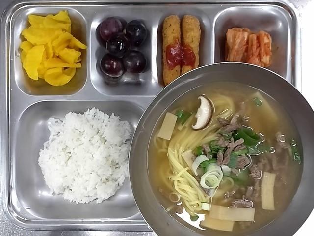 중식: 흰밥, 우욱탕면, 고구마치즈스틱, 꼬들꼬들단무지, 배추김치, 거봉포도