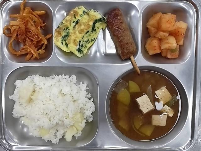석식: 감자밥, 호박두부된장국, 도라지엿장조림, 시금치계란말이, 통갈비맛바, 깍두기