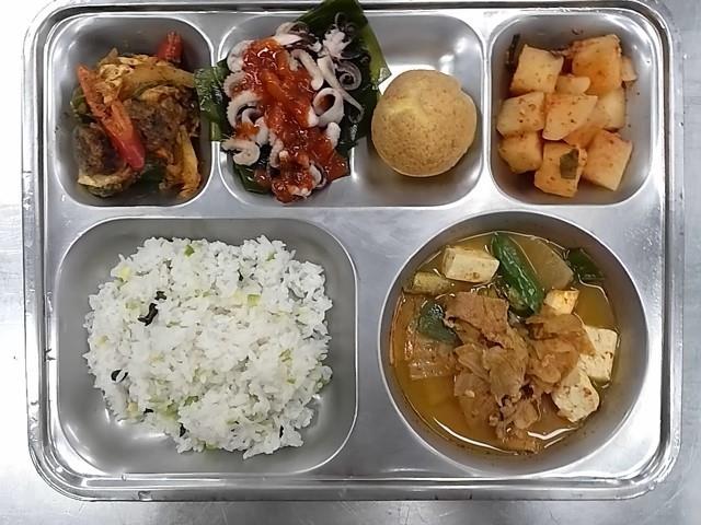 중식: 조각콩밥, 사태김치찌개, 주꾸미,다시마회+초장, 순대야채볶음, 깍두기, 생크림비스킷아이스슈