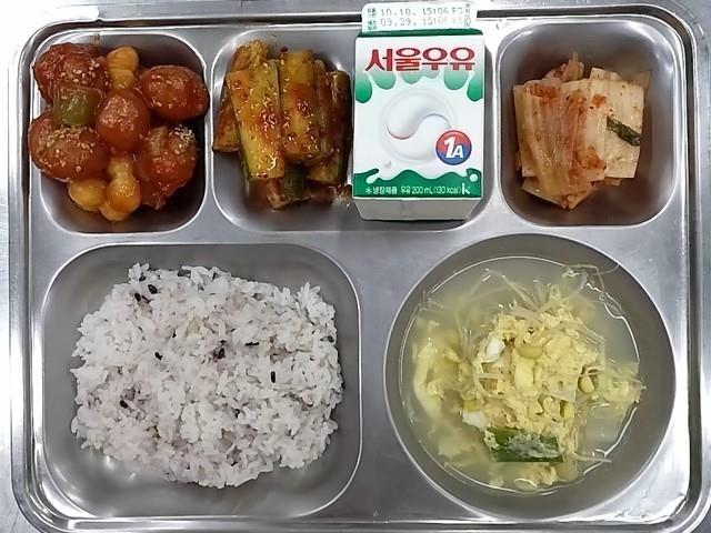조식: 혼합잡곡밥, 황태콩나물국, 스틱오이무침, 비엔나칠리소스볶음, 배추김치, 우유