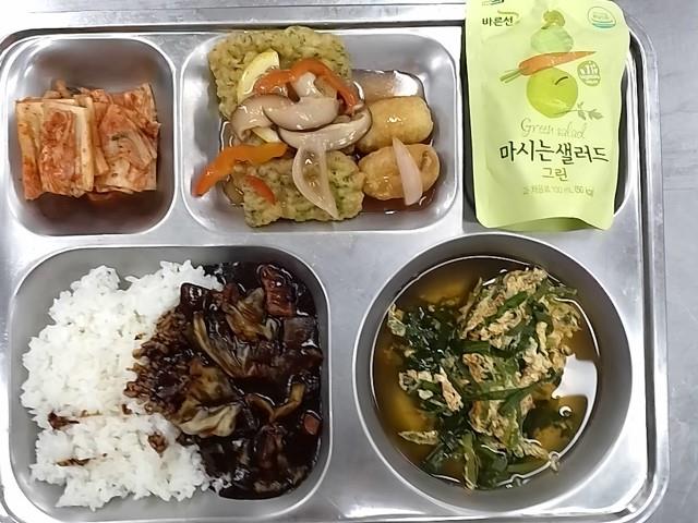 중식: 흰밥, 매운부추계란국물, 찹쌀꿔바로우+소스, 짜장소스, 마시는샐러드