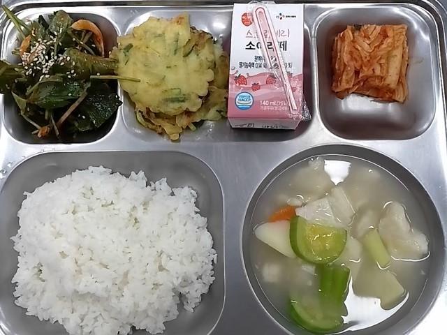 조식: 흰밥, 감자수제비국, 참나물초장무침, 애호박전, 배추김치, 스트로베리소이라떼