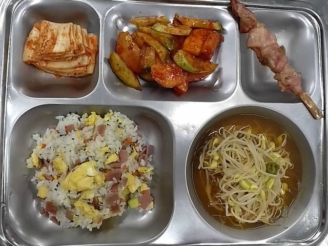 석식: 멸치달걀볶음밥, 매운콩나물국, 사과오이무침, 플라워닭꼬치+소스, 배추김치
