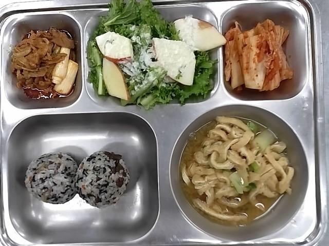 중식: 쇠고기주먹밥, 유부미소국, 불맛오리주물럭, 치커리사과샐러드, 배추김치