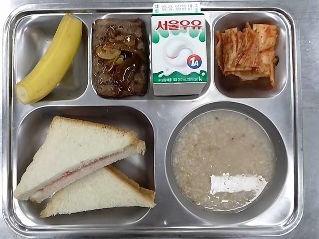 조식: 식빵+쨈, 파인애플떡갈비스테이크, 바나나, 우유, 숭늉/배추김치