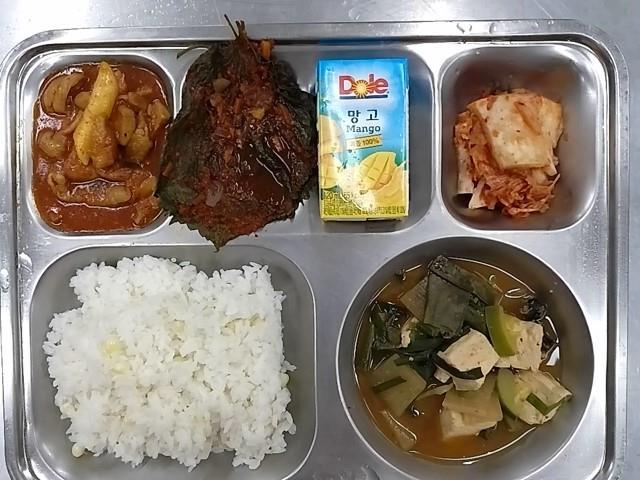 중식: 옥수수밥, 우렁된장찌개, 깻잎찜, 치즈불닭, 배추김치, 돌망고쥬스