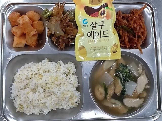 석식: 기장밥, 어묵찌개, 오징어채볶음, 크랩깐풍, 깍두기, 살구에이드