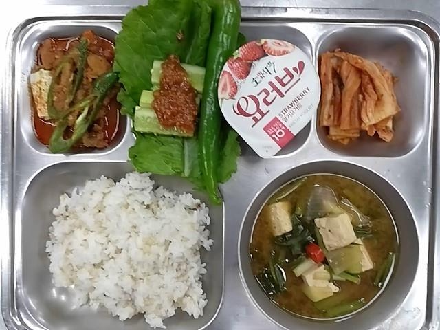 중식: 보리밥, 호박두부된장국, 상추야채스틱+쌈장, 돼지고기고추장볶음, 배추김치, 요플레