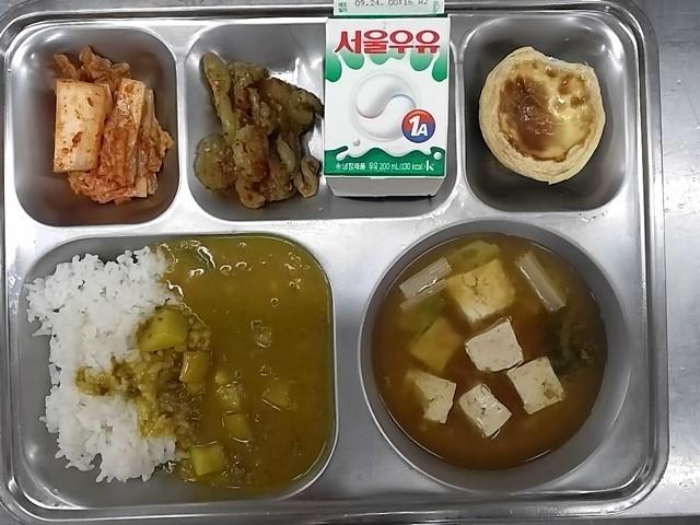 조식: 바몬드카레라이스, 미소시루, 오이장아찌무침, 배추김치, 페스츄리에그타르트, 우유
