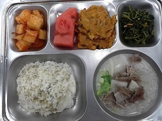점심: 기장밥,설렁탕/딩먄사리,비름고추장나물,오징어김치전,깍두기,수박