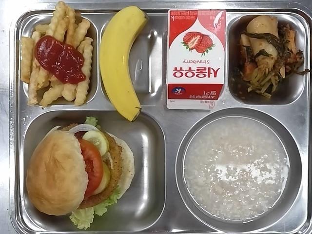 아침: 리얼치즈버거,감자튀김+케챱,바나나,딸기맛우유,숭늉/배추김치