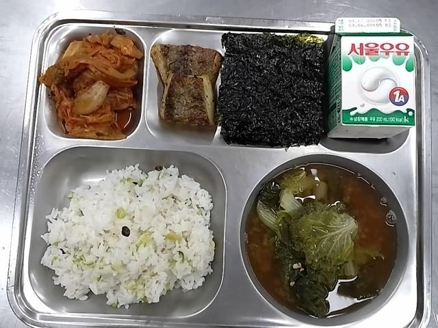 조식: 서리태조각콩밥, 얼갈이된장국, 김치볶음, 구이김, 애플데리야끼가자미구이, 우유