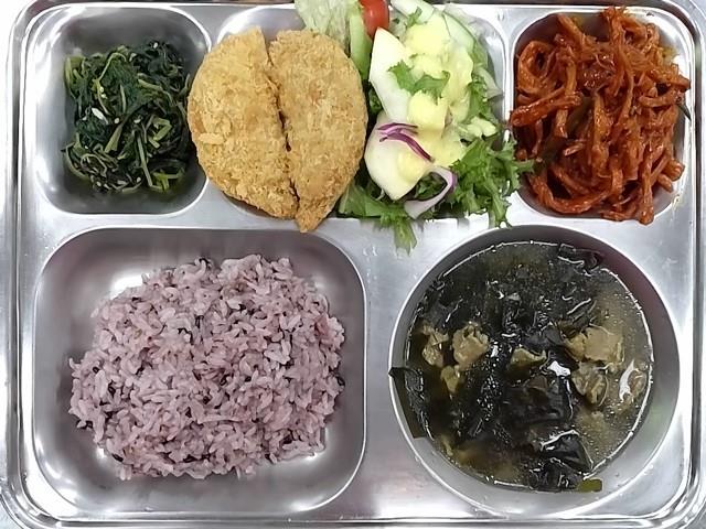 중식: 흑미밥, 쇠고기미역국, 통배추겉절이, 깻순나물, 진미채무침, 치킨케인즈샐러드