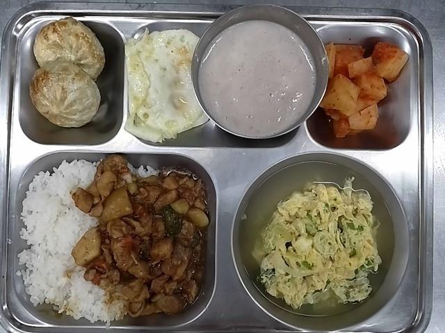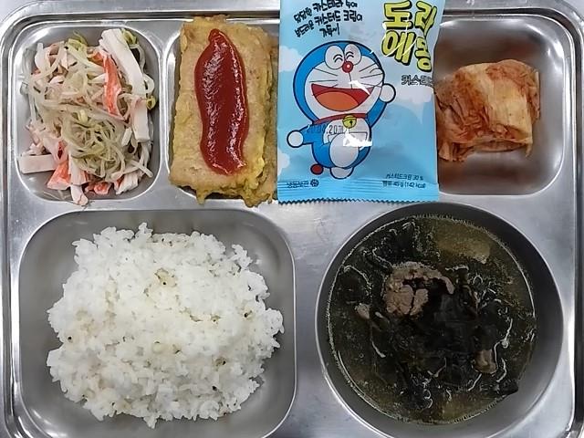 석식: 율무밥,쇠고기미역국,숙주맛살무침,스팸계란전+케챱,배추김치,도라에몽빵