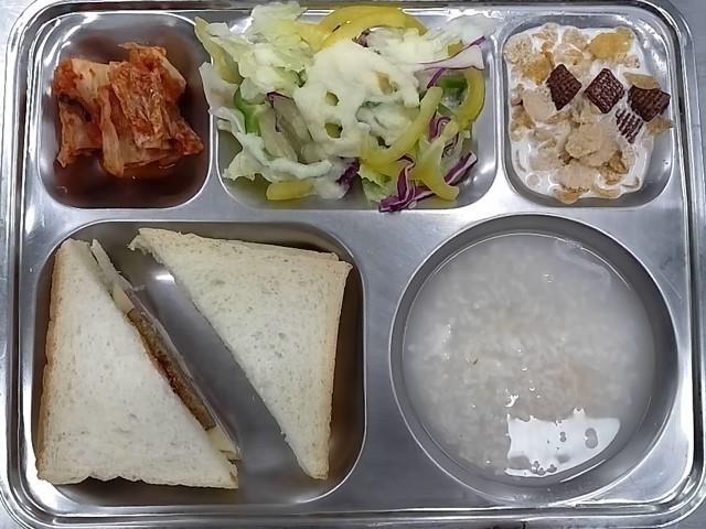 조식; 식빵+쨈,조랑떡함박+소스,양상추샐러드+파인소스,씨리얼+우유, 숭늉+배추김치