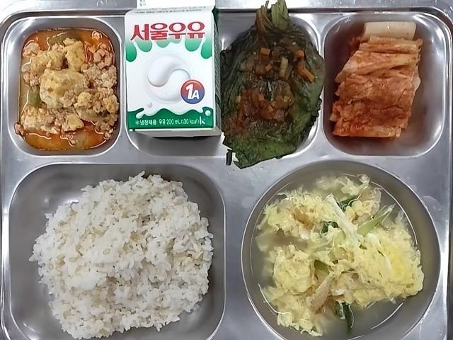 조식: 발아현미밥, 북어계란국, 깻잎양념장, 마파두부, 배추김치, 우유