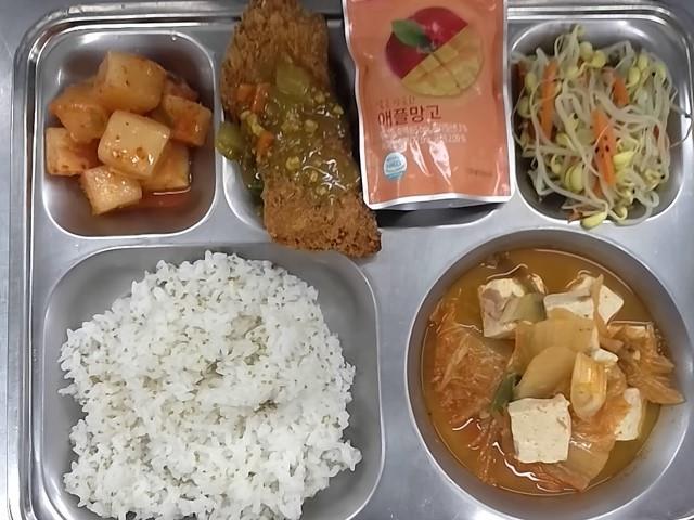중식: 기장밥, 참치찌개, 고구마치즈롤까스/인델리데미커, 콩나물무침, 깍두기, 애플망고쥬스