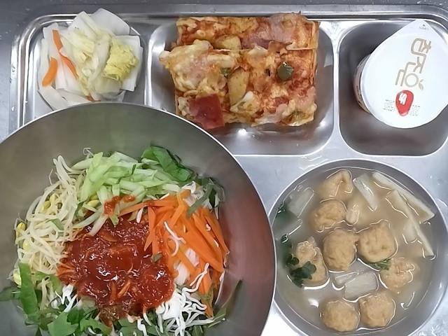 석식: 어묵우동국, 비빔국수, 포테이토사각피자, 백김치, 청포도소르베
