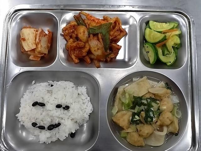 조식: 검정콩밥, 어묵쑥갓국, 오징어불고기, 호박새우젓볶음, 배추김치