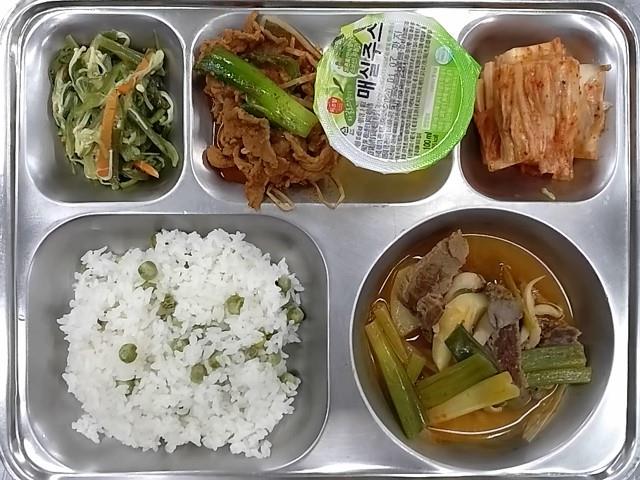 석식: 완두콩밥, 느타리버섯찌개, 돈육콩나물볶음, 미역줄기팽이볶음, 배추김치, 매실쥬스