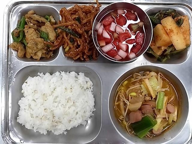 중식: 율무밥, 부대찌개, 우엉어묵고추볶음, 총각김치, 오미자화채