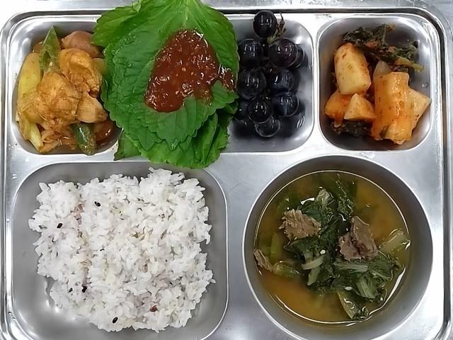 점심: 혼합10곡밥,쇠고기배추국,철판닭갈비,상추깻잎+쌈장,총각김치,포도