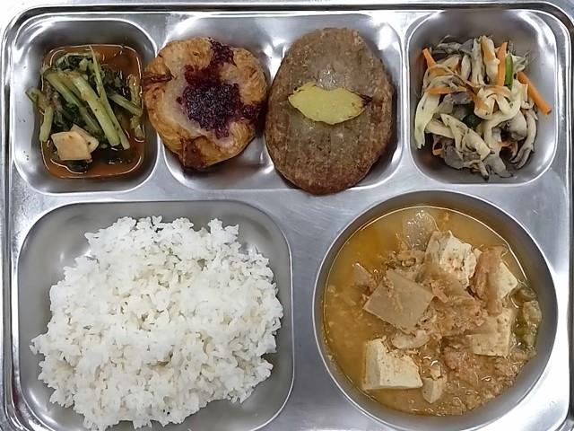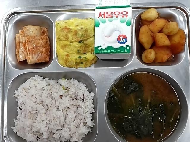 아침: 혼합잡곡밥,시금치된장국,감자매운조림,야채계란말이,배추김치,우유