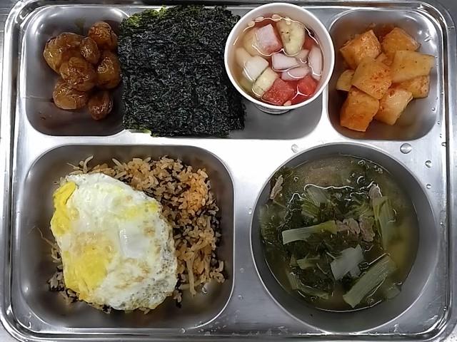 중식 : 콩나물김치볶음밥, 쇠고기배추국, 계란후라이, 구운김, 깍두기, 수박화채