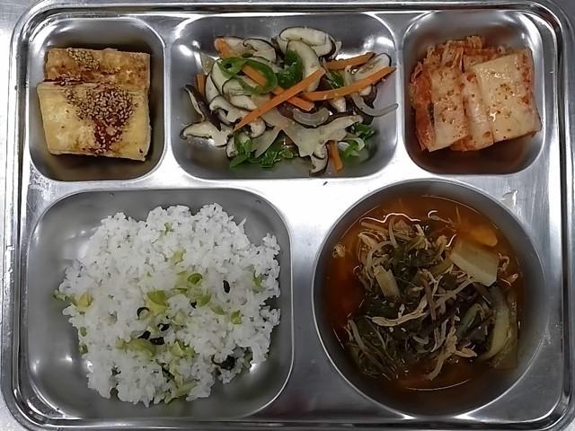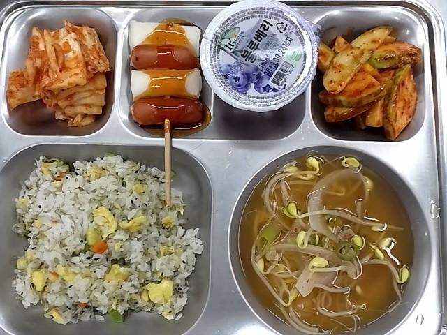 석식: 멸치달걀볶음밥, 매운콩나물국, 사과오이무침, 소떡소떡, 배추김치, 블루베리쥬스