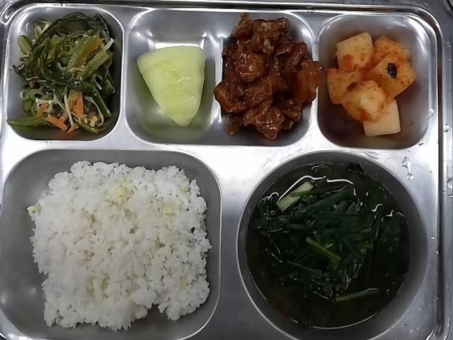 중식: 옥수수밥, 부추올갱이국, 목살스테이크, 미역줄기팽이볶음, 깍두기,메론