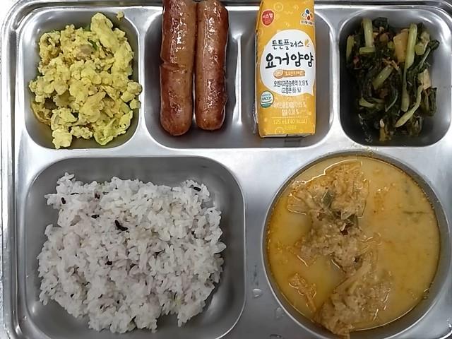 석식 : 혼합10곡밥, 콩비지찌개, 부어스트오븐구이, 양송이스크램블+소스, 열무김치, 오렌지요거얌얌
