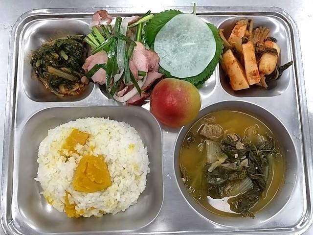 중식 : 단호박밥, 쇠고기배추국, 오리훈제+부추, 근대고추장무침, 와사비무쌈&깻잎, 자두