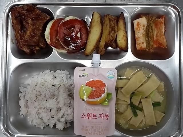 중식 : 혼합잡곡밥, 어묵미소국, 바베큐폭립, 갈릭웨지감자, 배추김치, 카브레제샐러드, 스위트 자몽쥬스